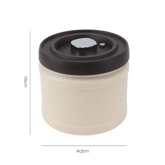 Recipiente de café con cierre hermético y una innovadora tapa con bomba manual que permite hacer vacío en su interior. Esto garantiza preservar la calidad y el sabor de los granos de café durante un tiempo más prolongado luego de retirarlo del packaging.